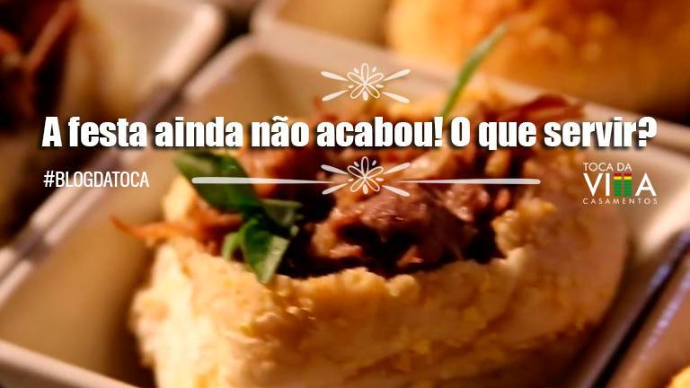 Evidente que os noivos, junto ao Buffet, terão liberdade para escolher o que será servido. Mas a regra aqui é praticidade e descontração. O que quer que seja servido, precisa ser prático. Não pode o convidado ter que se sentar para comer. É contraditório com a situação que se apresenta. E este serviço não pode causar o esvaziamento da pista. Ao contrário: é para tornar este momento de pista mais agradável. As opções são muitas: petiscos diversos, escondidinho, pequenas porções de shiitake, pequenas porções de ceviche.